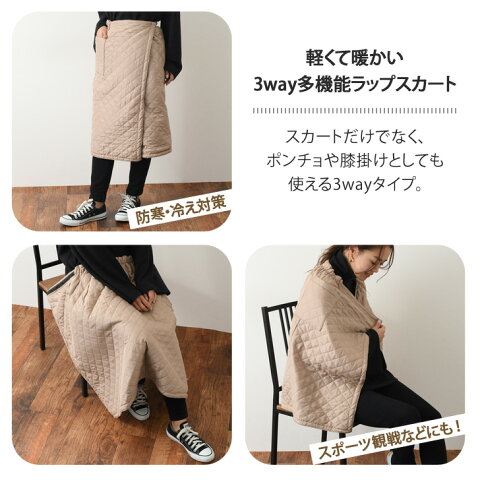3way多機能ラップスカート ウエストは6つのスナップボタンで様々なサイズ調整が可能 背面は伸縮ゴム仕様で動きやすく、程良くフィットしてくれるのも魅力 キルティング×フリース素材のリバーシブル仕様 風を通しにくいキルティング加工 あったかフリース素材で急な冷え対策にも◎ スカートだけでなく、ポンチョや膝掛けとしても使える3wayタイプ ★